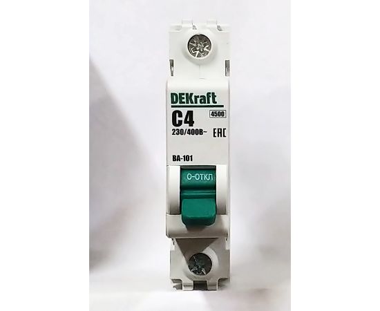 Автоматический выключатель серии ВА-101 DEKraft, 1P, номинальный ток 4 А, характеристика С, отключающая способность 4,5 кА. Новый механизм расцепления мгновенно разрывает цепь при возникновении аварии. 5 монолитных заклепок повышают прочность корпуса аппарата. Сплошная лицевая панель обеспечивает безопасность эксплуатации аппарата. Боковые каналы охлаждения повышают стабильность работы при высоких температурах окружающей среды. Полностью автоматизированный контроль качества производства.