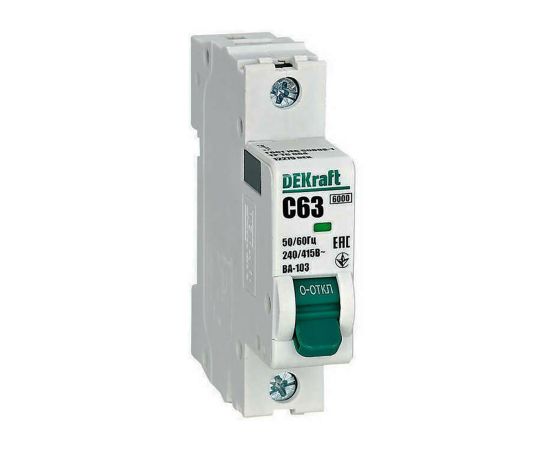 Автоматический выключатель серии ВА-103 DEKraft, 1P, номинальный ток 63 А, характеристика С, отключающая способность 6 кА. Новый механизм расцепления мгновенно разрывает цепь при возникновении аварии. 5 монолитных заклепок повышают прочность корпуса аппарата. Сплошная лицевая панель обеспечивает безопасность эксплуатации аппарата. Боковые каналы охлаждения повышают стабильность работы при высоких температурах окружающей среды. Полностью автоматизированный контроль качества производства.