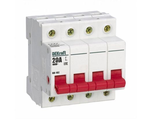 Выключатель-разъединитель серии ВН-102 DEKraft; 4P; номинальный ток 20 А; установка – на DIN-рейку; установочное положение - любое. Выключатели-разъединители применяются для ручного включения/отключения сетей напряжением до 400 В. Специальные мостиковые контакты обеспечивают надежный разрыв цепи; они полностью исключают возможность перекрытия дугой по изоляции. Усиленная рукоятка управления обеспечивает большое количество включений/отключений.