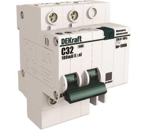 Автоматический выключатель дифференциального тока серии ДИФ-101 DEKraft; 2P; ном.ток 32 А; характеристика C; откл.способность Icn = 4,5 kA; ток утечки 30 мА; блок дифф.защиты and ndash; электронный; ширина and ndash; 3,5 мод. х 18 мм; монтаж and ndash; на DIN-рейку. АВДТ серии ДИФ-101 применяются в сетях напряжением до 400 В пер.тока для защиты человека от поражения электрическим током и электроустановок от сверхтоков и токов утечки. Для расширения функционала АВДТ возможно использование аксессуаров от выключателей серии ВА-101.