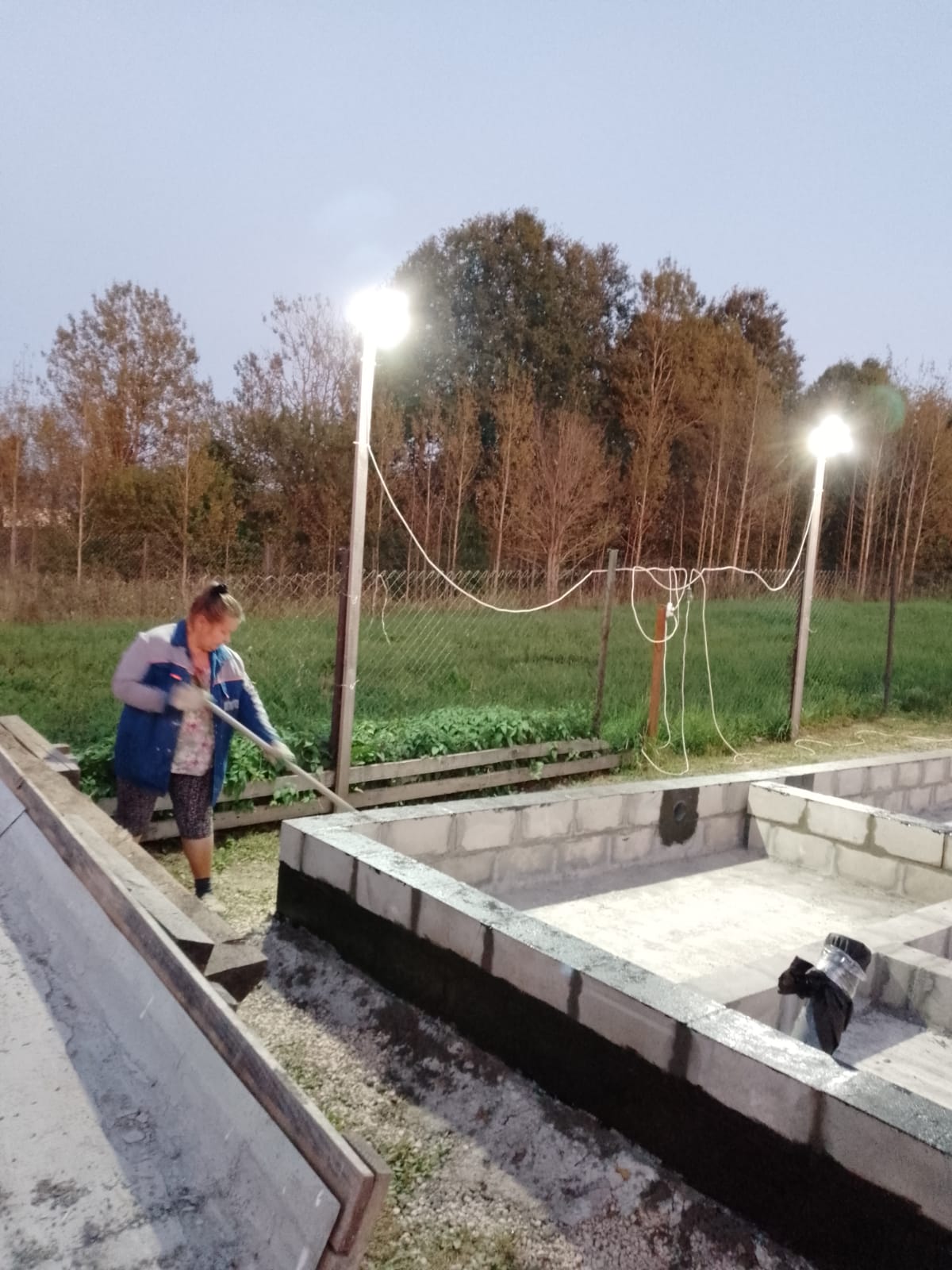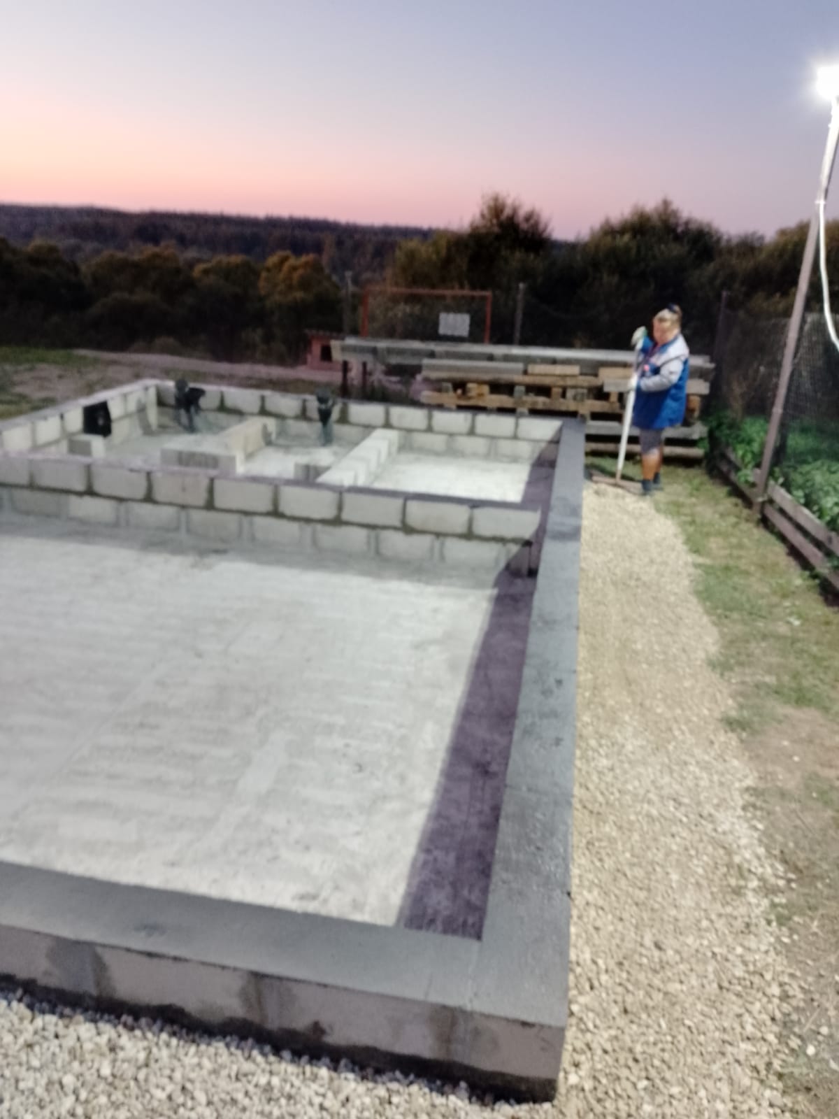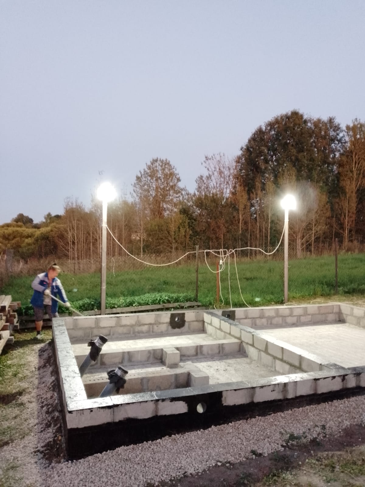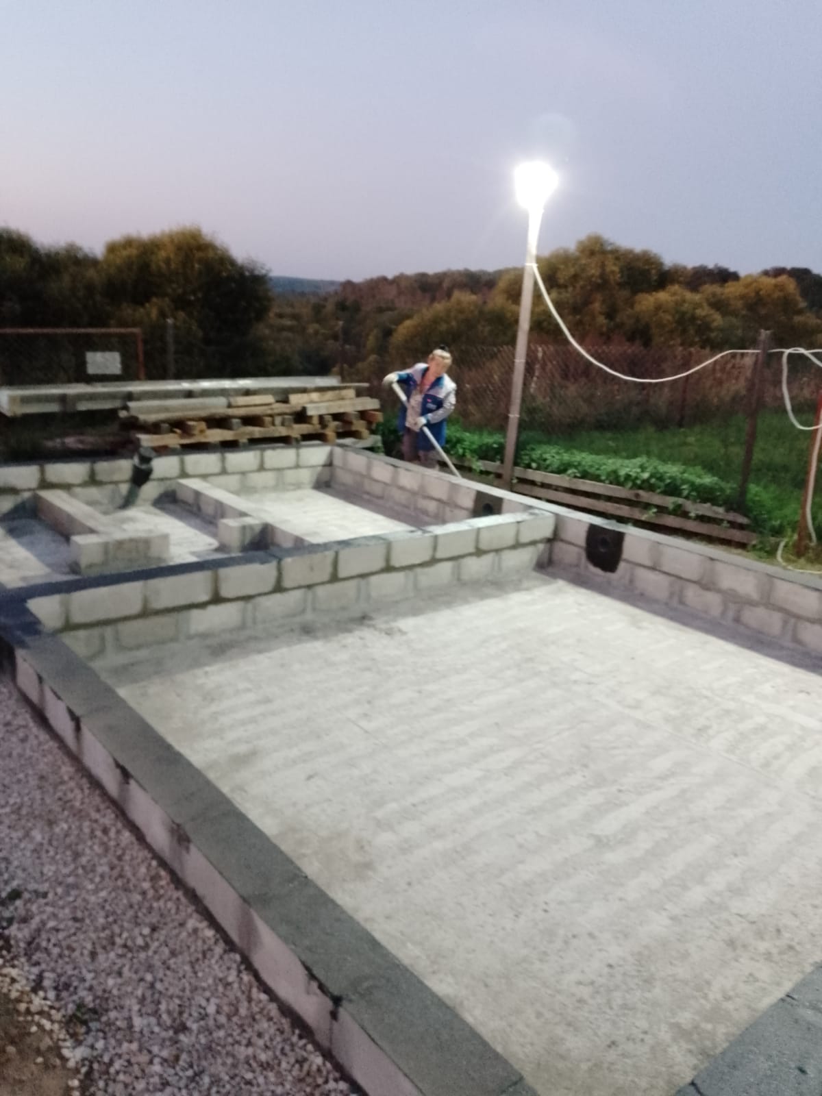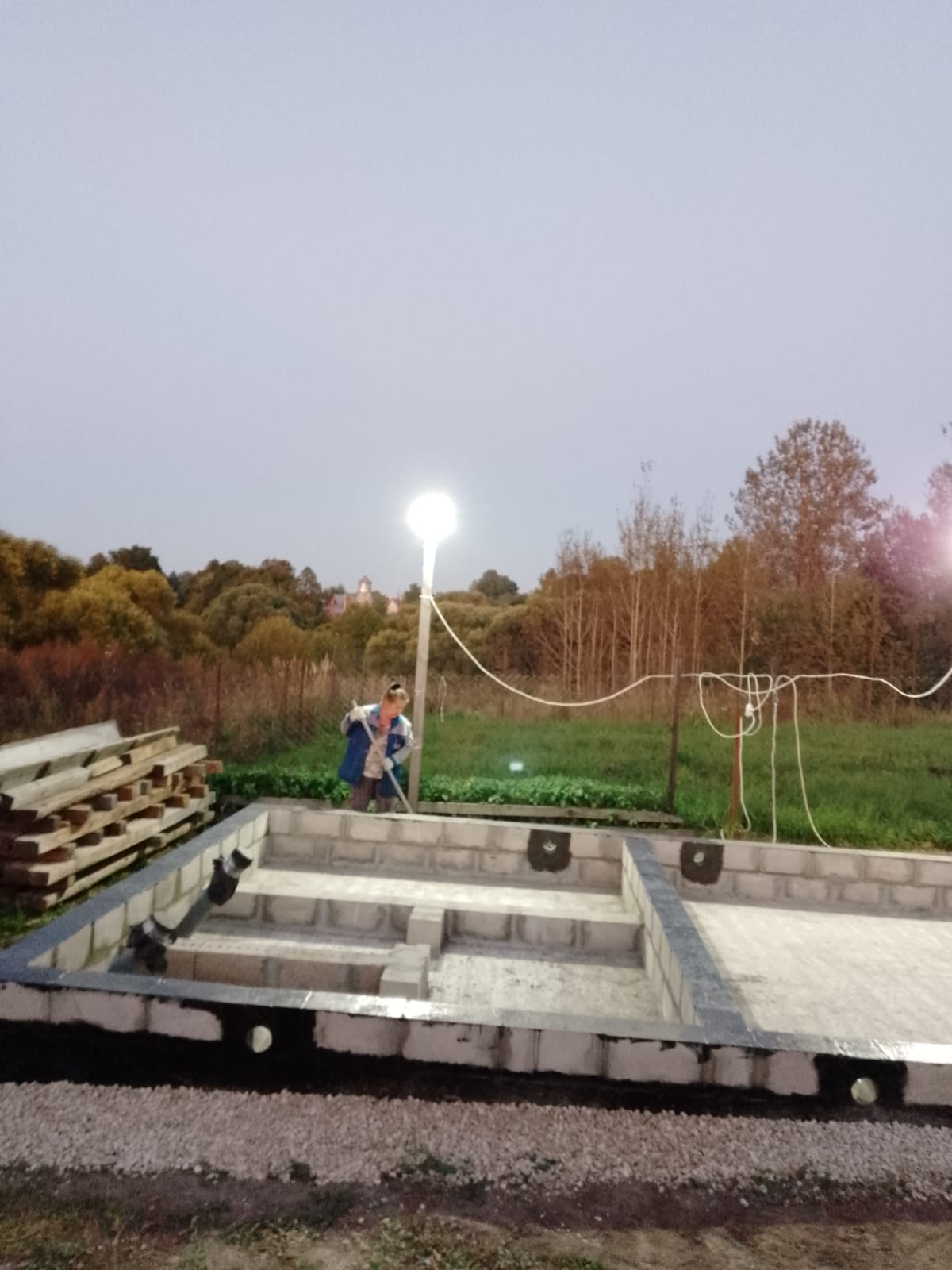 Фундаментная плита стоит. Цоколь подняли. Теперь необходимо выложить стен из газосиликата. Далее кровля и т.д.